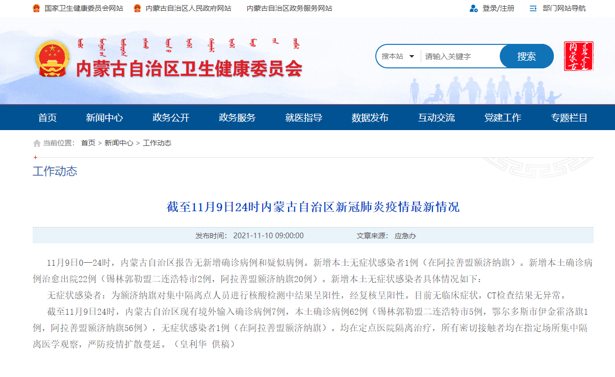 截至11月9日24時,內蒙古自治區現有境外輸入確診病例7例,本土確診病例62例(錫林郭勒盟二連浩特市5例,鄂爾多斯市伊金霍洛旗1例,阿拉善盟額濟納旗56例),無癥狀感染者1例(在阿拉善盟額濟納旗)。均在定點醫院隔離治療,所有密切接觸者均在指定場所集中隔離醫學觀察,嚴防疫情擴散蔓延。