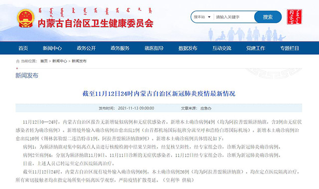 截至11月12日24時,內蒙古自治區現有境外輸入確診病例6例,本土確診病例26例(均為阿拉善盟額濟納旗)。均在定點醫院隔離治療,所有密切接觸者均在指定場所集中隔離醫學觀察,嚴防疫情擴散蔓延。