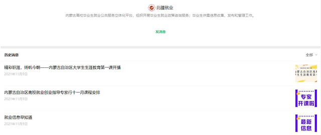11月9日,內(nèi)蒙古自治區(qū)高校學(xué)生就業(yè)創(chuàng)業(yè)服務(wù)中心的公眾號“北疆就業(yè)”發(fā)布了“內(nèi)蒙古自治區(qū)高校就業(yè)創(chuàng)業(yè)指導(dǎo)專家行”十一月的課程安排,高校畢業(yè)生登錄北疆就業(yè)平臺即可學(xué)習(xí)專業(yè)的求職就業(yè)課程。
