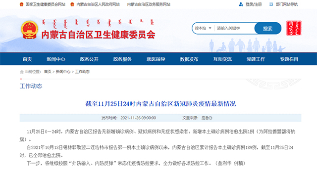 截至11月25日24時 內蒙古本土確診病例已全部治愈出院
