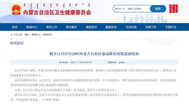 人民網呼和浩特11月28日電 (趙夢月)11月28日,內蒙古自治區衛生健康委員會通報,11月27日0—24時,內蒙古自治區報告無新增確診病例和疑似病例,新增本土無癥狀感染者3例(均在呼倫貝爾滿洲里市)。新增本土無癥狀感染者具體情況如下:
