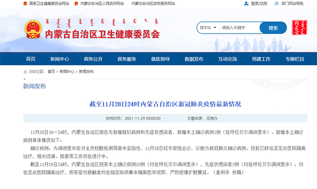 人民網呼和浩特11月29日電 (趙夢月)據內蒙古自治區衛生健康委員會通報,11月28日16—24時,內蒙古自治區報告無新增疑似病例和無癥狀感染者,新增本土確診病例1例(在呼倫貝爾滿洲里市)。