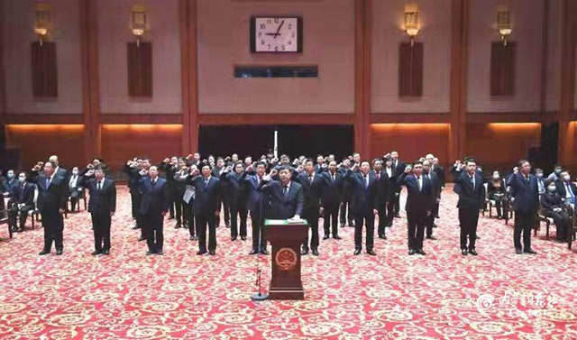 宣誓儀式現場國徽高懸、國旗莊嚴,宣誓臺上擺放著《中華人民共和國憲法》。上午9時整,宣誓儀式開始。全體起立,唱中華人民共和國國歌。隨后,領誓人手撫憲法、領誦誓詞,其他宣誓人跟誦誓詞。