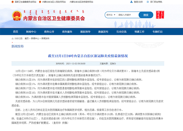 人民網呼和浩特12月2日電 (趙夢月)據內蒙古衛健委通報,12月1日0—24時,內蒙古自治區報告無新增疑似病例,新增本土確診病例53例(均為呼倫貝爾滿洲里市),新增本土無癥狀感染者1例(為呼倫貝爾市新巴爾虎右旗)。