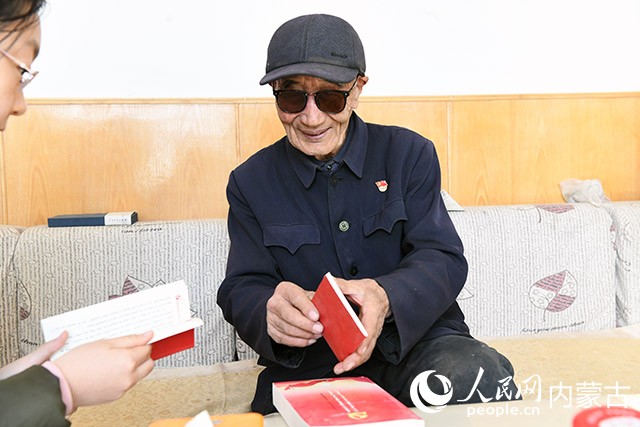 斯仁塔日娃灰撲撲的褲子上沾滿了泥土,在他身前放著三冊紅色書籍。“這本是《黨的基本知識(shí)蒙漢語對照學(xué)習(xí)手冊》,”斯仁塔日娃捧著書介紹,“這兩本是黨的十九大報(bào)告和《黨章》,每天晚上我就坐在這兒,點(diǎn)著燈看一會(huì)兒。”老人的笑容慈祥而真摯。