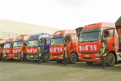 10月24日,一輛輛掛著大紅綢、載著“暖心煤”的運煤大卡車排成一列,從鄂爾多斯達拉特旗杭蓋溝煤礦整裝待發,即將發往位于吉格斯太鎮的榮通煤炭物流園區,那里是該鎮“暖心煤”的發放點。