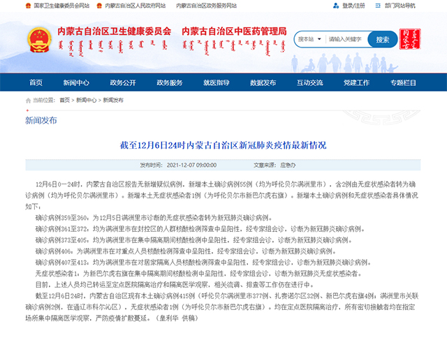 人民網呼和浩特12月7日電 (王慧)據內蒙古衛健委通報,12月6日0—24時,內蒙古自治區報告無新增疑似病例,新增本土確診病例55例(均為呼倫貝爾滿洲里市),含2例由無癥狀感染者轉為確診病例(均為呼倫貝爾滿洲里市)。新增本土無癥狀感染者1例(為呼倫貝爾市新巴爾虎右旗)。
