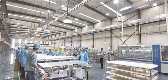 包頭阿特斯陽光能源科技有限公司技術人員在進行光伏設備安裝生產。記者 吳杰 攝