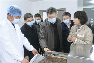自治區黨委常委、通遼市委書記孟憲東在弘達盛茂農牧科技發展有限公司調研蕎殼枕項目。記者 邵南 攝