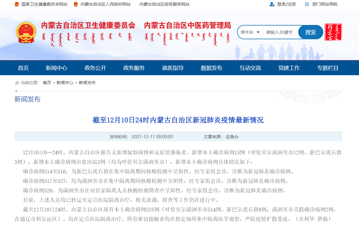 截至12月10日24時,內蒙古自治區現有本土確診病例525例(呼倫貝爾滿洲里市514例、新巴爾虎右旗9例;滿洲里市關聯確診病例2例,在通遼市科爾沁區)。均在定點醫院隔離治療,所有密切接觸者均在指定場所集中隔離醫學觀察,嚴防疫情擴散蔓延。