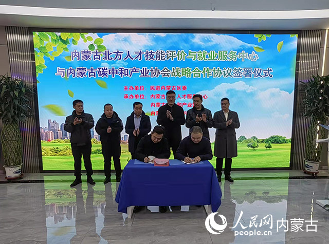人民網呼和浩特12月15日電(劉藝琳)12月15日,內蒙古北方人才技能評價與就業服務中心(以下簡稱“北方人才服務中心”)與內蒙古碳中和產業協會舉行碳排放專業領域人才培養戰略合作協議簽約和授牌儀式。內蒙古碳中和產業協會授予北方人才服務中心為內蒙古碳中和產業協會理事單位。