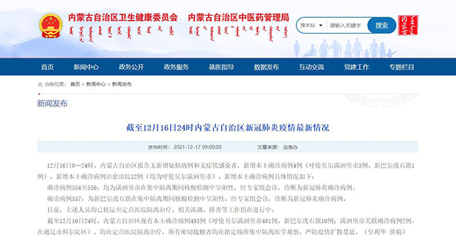 人民網(wǎng)呼和浩特12月17日電 (王慧)據(jù)內(nèi)蒙古衛(wèi)健委通報,12月16日0—24時,內(nèi)蒙古自治區(qū)報告無新增疑似病例和無癥狀感染者,新增本土確診病例4例(呼倫貝爾滿洲里市3例、新巴爾虎右旗1例)。新增本土確診病例治愈出院12例(均為呼倫貝爾滿洲里市)。新增本土確診病例具體情況如下: