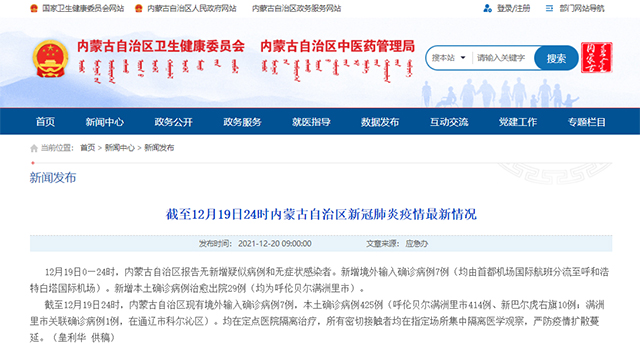 截至12月19日24時,內蒙古自治區現有境外輸入確診病例7例,本土確診病例425例(呼倫貝爾滿洲里市414例、新巴爾虎右旗10例;滿洲里市關聯確診病例1例,在通遼市科爾沁區)。均在定點醫院隔離治療,所有密切接觸者均在指定場所集中隔離醫學觀察,嚴防疫情擴散蔓延。