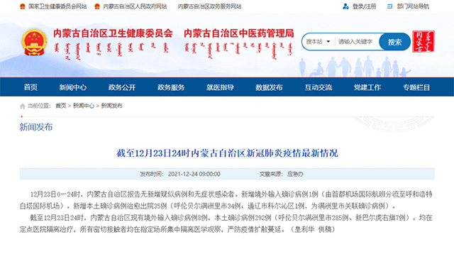 截至12月23日24時,內蒙古自治區現有境外輸入確診病例8例,本土確診病例292例(呼倫貝爾滿洲里市285例、新巴爾虎右旗7例)。均在定點醫院隔離治療,所有密切接觸者均在指定場所集中隔離醫學觀察,嚴防疫情擴散蔓延。