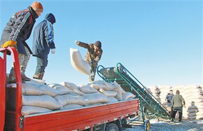 把分紅的飼料裝車。