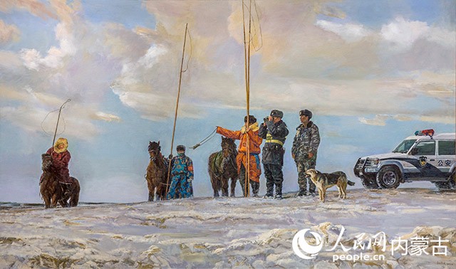 《草原110》描繪了在天寒地凍的內(nèi)蒙古邊境牧區(qū),一輛輛“草原110”像一條條紐帶把邊境牧區(qū)黨委政府、軍警官兵、各族群眾串聯(lián)在一起,共同筑牢祖國北疆安全穩(wěn)定屏障的美好畫面,偉大的愛國情懷躍然紙上。“這幅作品采用仰視透視法,將人物推到中景,使得畫面更加遼闊,表現(xiàn)出地廣人稀的環(huán)境。”楊伶武還介紹說,畫面中表現(xiàn)的是軍、警、民三方聯(lián)防,在中蒙邊界線上巡邏的場景。