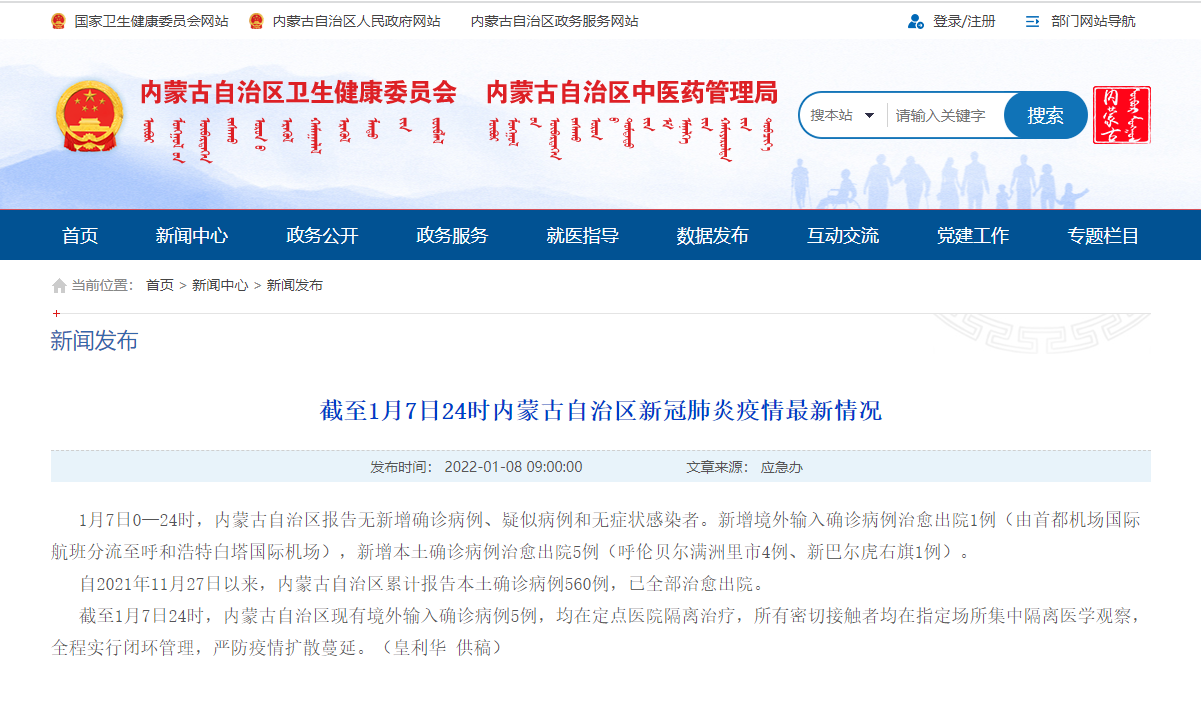 自2021年11月27日以來,內蒙古自治區累計報告本土確診病例560例,已全部治愈出院。