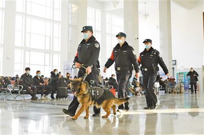 春運期間,中鐵呼和浩特局包頭鐵路公安處加強巡查,執勤民警與警犬一同“加班”堅守。唐哲 攝