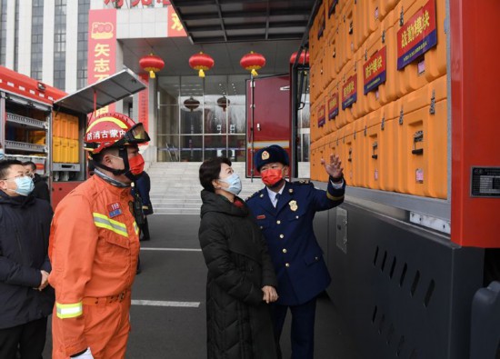 1月30日,自治區黨委副書記、自治區主席王莉霞在內蒙古消防救援總隊檢查消防救援值班值守工作。內蒙古日報社融媒體記者 韓卿立 攝
