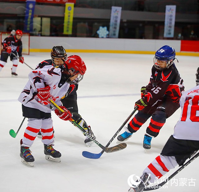 青少年冰球運(yùn)動(dòng)員正在冰場(chǎng)訓(xùn)練。人民網(wǎng) 劉藝琳攝