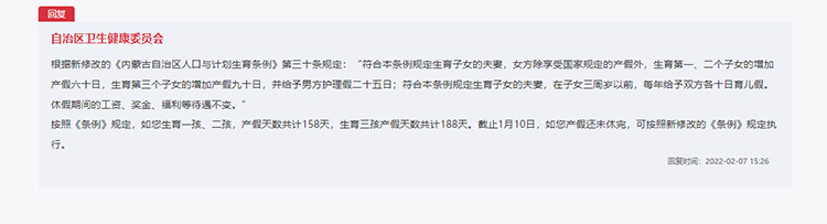 內蒙古自治區衛生健康委員會對網友的留言進行了答復,根據新修改的《內蒙古自治區人口與計劃生育條例》(以下簡稱《條例》)第三十條規定:“符合本條例規定生育子女的夫妻,女方除享受國家規定的產假外,生育第一、二個子女的增加產假六十日,生育第三個子女的增加產假九十日,并給予男方護理假二十五日;符合本條例規定生育子女的夫妻,在子女三周歲以前,每年給予雙方各十日育兒假。休假期間的工資、獎金、福利等待遇不變。”按照《條例》規定,如生育一孩、二孩,產假天數共計158天,如生育三孩產假天數共計188天。截至1月10日,如產假還未休完,可按照新修改的《條例》規定執行。