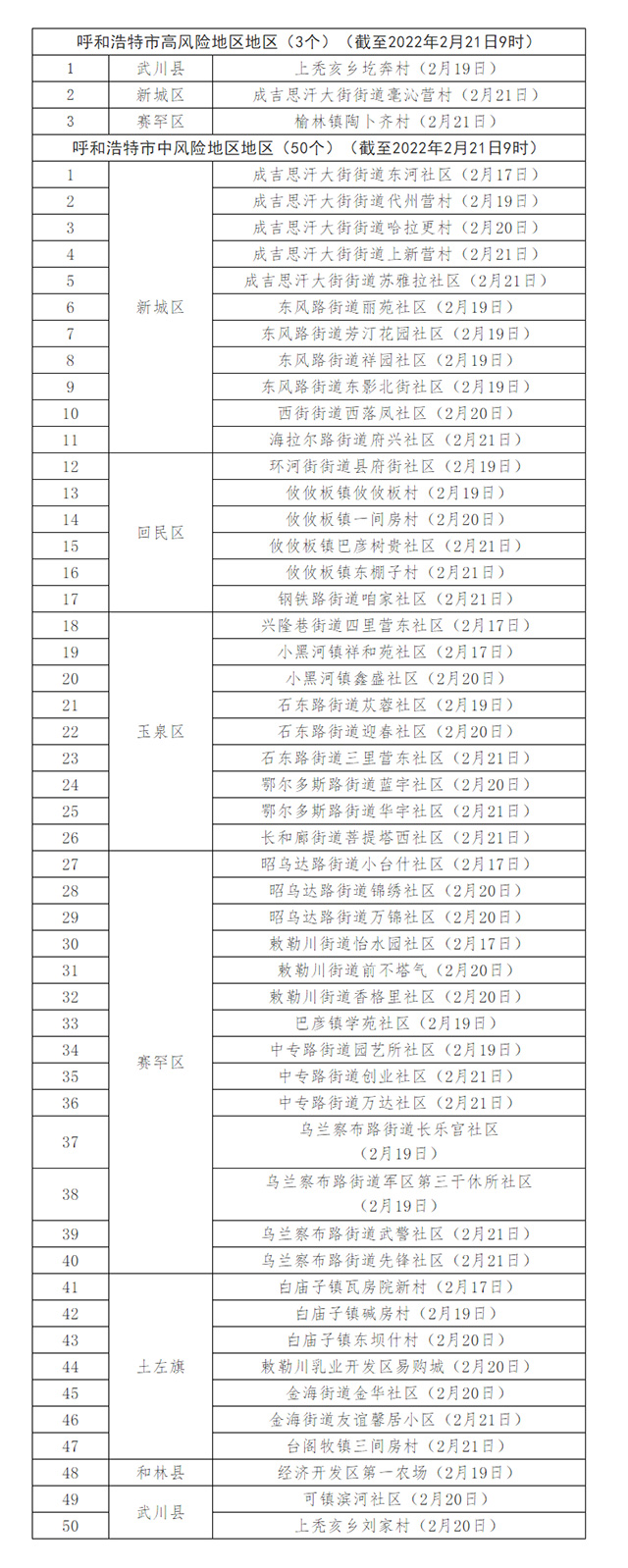 自2022年2月21日9時(shí)起,將新城區(qū)成吉思汗大街街道毫沁營村、賽罕區(qū)榆林鎮(zhèn)陶卜齊村調(diào)整為高風(fēng)險(xiǎn)地區(qū);將新城區(qū)成吉思汗大街街道上新營村、蘇雅拉社區(qū),海拉爾路街道府興社區(qū);回民區(qū)攸攸板鎮(zhèn)巴彥樹貴社區(qū)、東棚子村,鋼鐵路街道咱家社區(qū);玉泉區(qū)石東路街道三里營東社區(qū),鄂爾多斯路街道華宇社區(qū),長和廊街道菩提塔西社區(qū);賽罕區(qū)中專路街道創(chuàng)業(yè)社區(qū)、萬達(dá)社區(qū),烏蘭察布路街道武警社區(qū)、先鋒社區(qū);土左旗金海街道友誼馨居小區(qū),臺閣牧鎮(zhèn)三間房村調(diào)整為中風(fēng)險(xiǎn)地區(qū)。