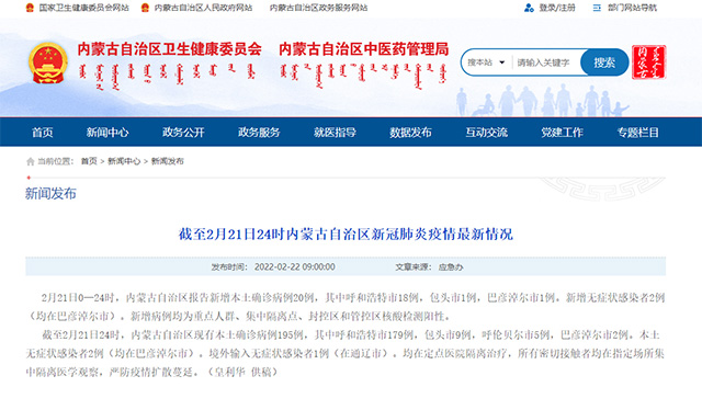 人民網呼和浩特2月22日電(趙夢月)2月22日,內蒙古衛健委通報,2月21日0—24時,內蒙古自治區報告新增本土確診病例20例,其中呼和浩特市18例,包頭市1例,巴彥淖爾市1例。新增無癥狀感染者2例(均在巴彥淖爾市)。新增病例均為重點人群、集中隔離點、封控區和管控區核酸檢測陽性。