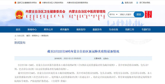 - 內蒙古自治區衛健委官網截圖 人民網呼和浩特2月23日電 (劉澤)2月23日,內蒙古衛健委通報,2月22日0—24時,內蒙古自治區報告新增本土確診病例47例(含1例由無癥狀感染者轉為確診病例),其中呼和浩特市39例,包頭市7例,巴彥淖爾市1例(由無癥狀感染者轉為確診病例)。 截至2月22日24時,內蒙古自治區現有本土確診病例242例,其中呼和浩特市218例,包頭市16例,呼倫貝爾市5例,巴彥淖爾市3例。…