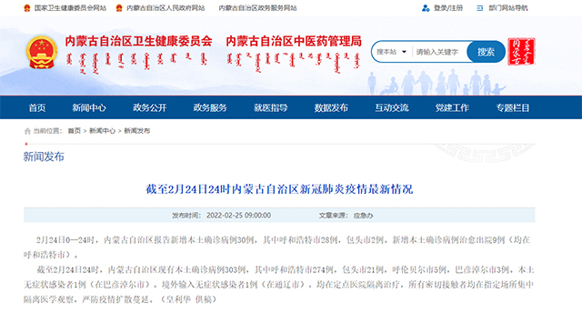 人民網(wǎng)呼和浩特2月25日電(趙夢(mèng)月)2月25日,據(jù)內(nèi)蒙古衛(wèi)健委通報(bào),2月24日0—24時(shí),內(nèi)蒙古自治區(qū)報(bào)告新增本土確診病例30例,其中呼和浩特市28例,包頭市2例。新增本土確診病例治愈出院9例(均在呼和浩特市)。