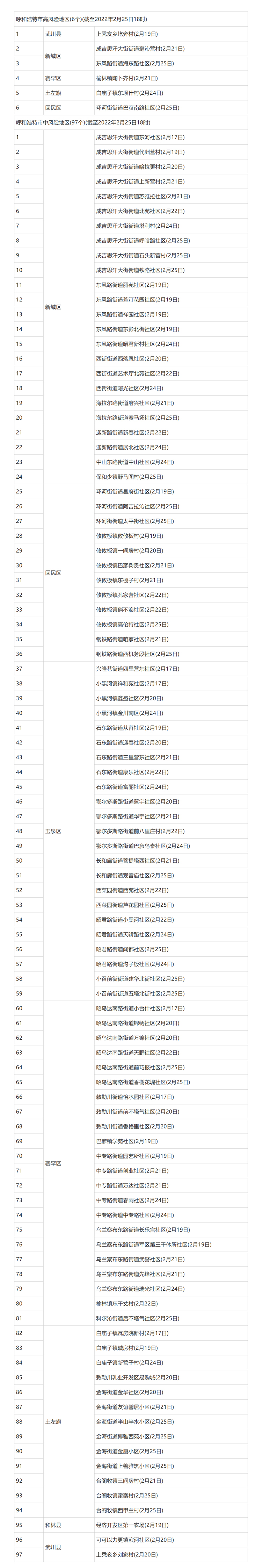 自2022年2月25日18時起,將新城區(qū)東風(fēng)路街道海東路社區(qū),回民區(qū)環(huán)河街街道巴彥南路社區(qū)調(diào)整為高風(fēng)險地區(qū);將新城區(qū)成吉思汗大街街道呼哈路社區(qū)、石頭新營村、鐵路社區(qū),海拉爾路街道賽馬場社區(qū),保和少鎮(zhèn)野馬圖村;回民區(qū)環(huán)河街街道阿吉拉沁社區(qū)、太平街社區(qū),攸攸板鎮(zhèn)高倫特社區(qū),鋼鐵路街道西機(jī)務(wù)段社區(qū);玉泉區(qū)長和廊街道觀音廟社區(qū),西菜園街道蘆花園社區(qū),昭君路街道聞都社區(qū),小召前街街道建華北街社區(qū)、五塔北街社區(qū);賽罕區(qū)昭烏達(dá)南路街道前巧報社區(qū)、香榭花堤社區(qū),科爾沁街道后不塔氣社區(qū);土左旗金海街道半山半水小區(qū)、博雅西苑小區(qū)、金廈小區(qū)、上善雅筑小區(qū),臺閣牧鎮(zhèn)霍寨村、西甲蘭村調(diào)整為中風(fēng)險地區(qū)。