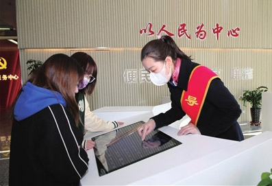 盟政務(wù)服務(wù)中心工作人員引導(dǎo)辦事人員在端口了解事項(xiàng)分類。記者 毛鳳鳴 攝
