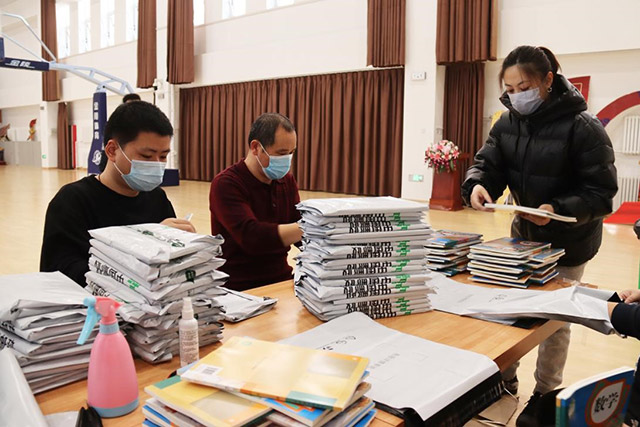 教職工在給分裝好的教材貼郵寄單。李穎劍攝