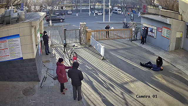 監控畫面顯示,8時19分左右,一位老人在小區門口突然摔倒在地,老人勉強起身之后,踉蹌幾步就倒在地上,一動不動。隨后,民主社區居委會副主任魏紅霞騎車經過,看到躺在地上的老人,她趕忙上前,很快就認出來,這是小區里的一位獨居老人,平日里做保潔工作,老伴長期住院,孩子也在外地工作。她先是確認老人是否還有意識,在發現老人沒有心跳之后,迅速實施了心肺復蘇術。