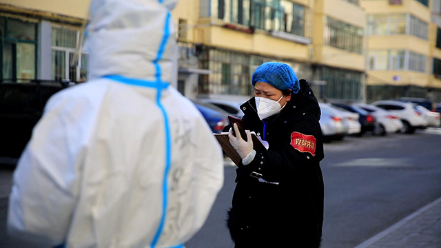 魏紅霞正在聯系為社區人員入戶做核酸。祝家樂攝