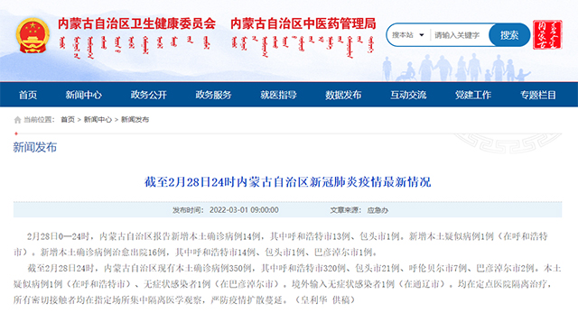 截至2月28日24時,內蒙古自治區現有本土確診病例350例,其中呼和浩特市320例、包頭市21例、呼倫貝爾市7例、巴彥淖爾市2例。本土疑似病例1例(在呼和浩特市)、無癥狀感染者1例(在巴彥淖爾市)。境外輸入無癥狀感染者1例(在通遼市)。均在定點醫院隔離治療,所有密切接觸者均在指定場所集中隔離醫學觀察,嚴防疫情擴散蔓延。