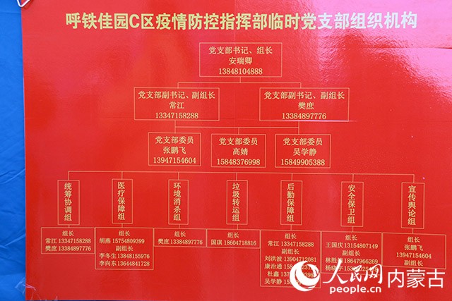 呼鐵佳園C區疫情防控指揮部臨時黨支部組織機構結構圖。人民網 寇雅楠攝