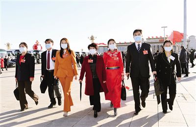 3月5日上午,出席十三屆全國人大五次會(huì)議的內(nèi)蒙古代表團(tuán)代表步入人民大會(huì)堂。記者 袁永紅 攝