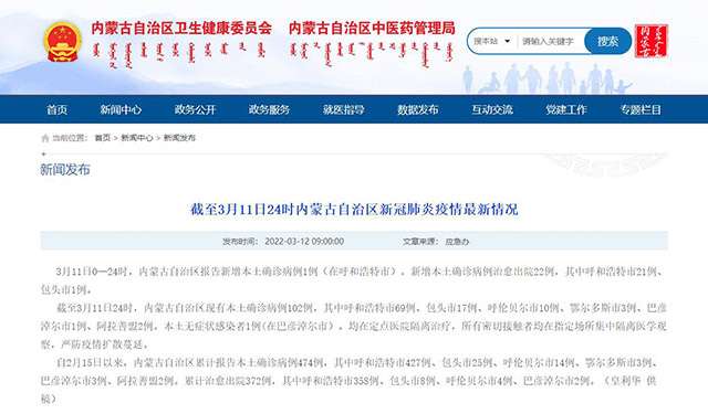 人民網(wǎng)呼和浩特3月12日電(張雪冬)3月12日,據(jù)內(nèi)蒙古衛(wèi)健委通報,3月11日0—24時,內(nèi)蒙古自治區(qū)報告新增本土確診病例1例(在呼和浩特市)。新增本土確診病例治愈出院22例,其中呼和浩特市21例、包頭市1例。