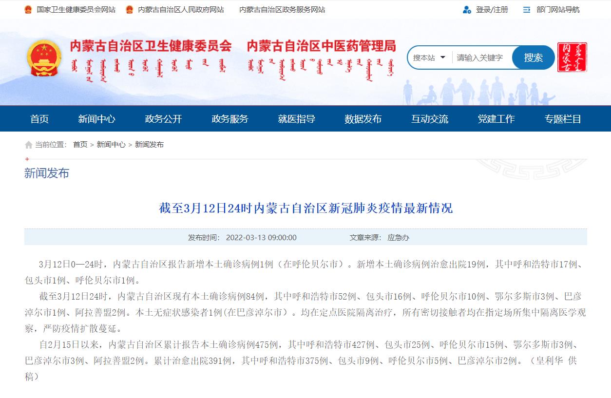 - 人民網呼和浩特3月13日電(趙夢月)3月13日,內蒙古衛健委通報,3月12日0—24時,內蒙古自治區報告新增本土確診病例1例(在呼倫貝爾市)。新增本土確診病例治愈出院19例,其中呼和浩特市17例、包頭市1例、呼倫貝爾市1例。…