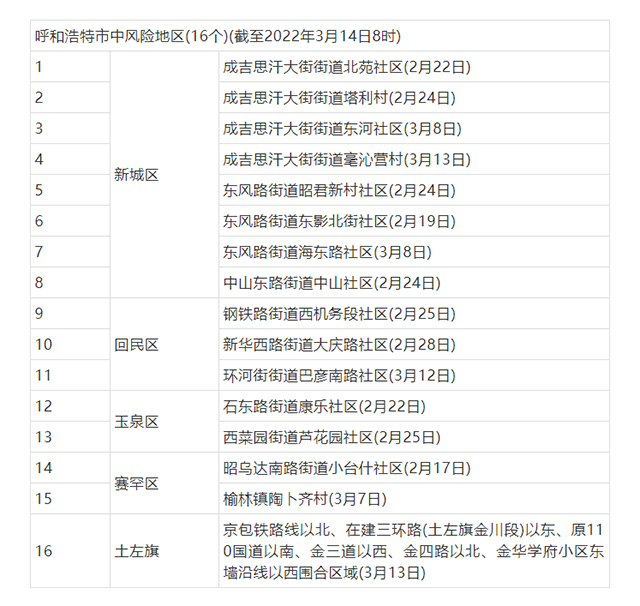 人民網呼和浩特3月14日電(趙夢月)3月14日,內蒙古呼和浩特市新冠肺炎疫情防控工作指揮部發布公告,按照國務院聯防聯控機制《關于調整新冠肺炎疫情分區分級標準實施精準管控措施的通知》規定,經專家組評估,市指揮部研究決定,決定于3月14日8時起,將土左旗京包鐵路線以北、在建三環路(土左旗金川段)以東、原110國道以南、金三道以西、金四路以北、金華學府小區東墻沿線以西圍合區域調整為中風險地區;將土左旗白廟子鎮東壩什村調整為低風險地區。其他地區風險等級不變。