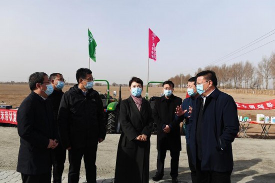 3月16日,自治區(qū)黨委副書記、自治區(qū)主席王莉霞在包頭市土右旗美岱召鎮(zhèn)瓦窯村玉米大豆帶狀復(fù)合種植萬畝示范基地調(diào)研。內(nèi)蒙古日報社融媒體記者韓卿立攝