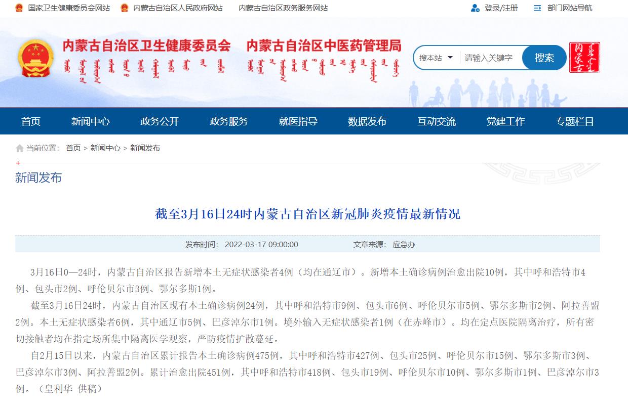 人民網呼和浩特3月17日電(趙夢月)3月17日,據內蒙古自治區衛生健康委員會通報,3月16日0—24時,內蒙古自治區報告新增本土無癥狀感染者4例(均在通遼市)。新增本土確診病例治愈出院10例,其中呼和浩特市4例、包頭市2例、呼倫貝爾市3例、鄂爾多斯1例。