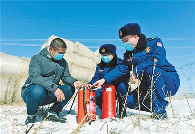 消防救援人員為阿拉塔布日古德一家詳細講解春季防火的重點安全知識后,又在草垛等易燃區演示滅火器的使用方法,并對他家電路存在的安全隱患進行了詳細排查。