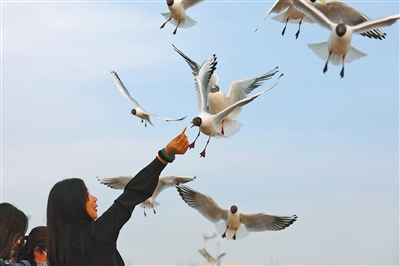 烏海市,市民喂食紅嘴鷗。記者 郝飚 攝