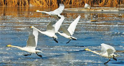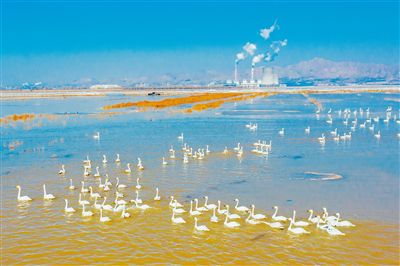 天鵝在黃河濕地棲息。記者 孟和朝魯 攝