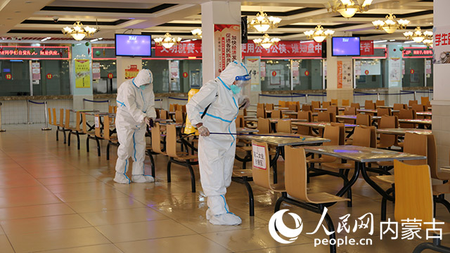 工作人員正在對賽罕區北京四中分校食堂進行消殺工作。劉士瑒攝