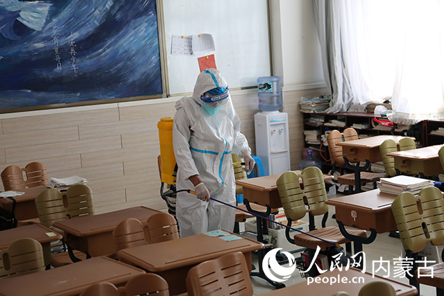 工作人員正在對賽罕區北京四中分校教室進行消殺工作。劉士瑒攝