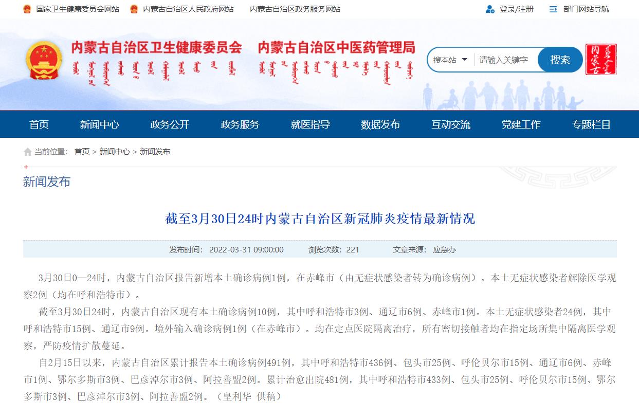 人民網呼和浩特3月31日電(趙夢月)3月31日,據內蒙古自治區衛生健康委員會通報,3月30日0—24時,內蒙古自治區報告新增本土確診病例1例,在赤峰市(由無癥狀感染者轉為確診病例)。本土無癥狀感染者解除醫學觀察2例(均在呼和浩特市)。