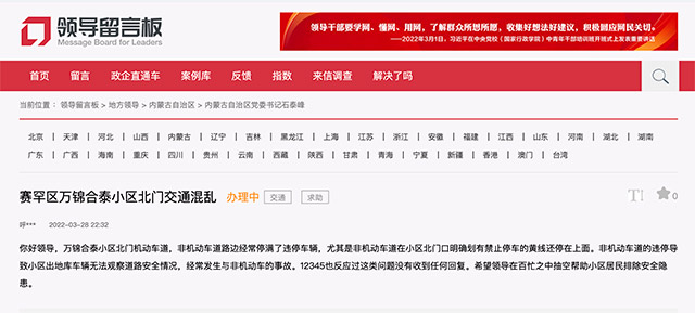 近日,來自內(nèi)蒙古自治區(qū)呼和浩特市的網(wǎng)友在人民網(wǎng)“領(lǐng)導(dǎo)留言板”留言,網(wǎng)友表示萬錦合泰小區(qū)北門的機(jī)動車道和非機(jī)動車道路邊經(jīng)常有違停車輛,導(dǎo)致出入小區(qū)地下車庫時(shí),無法觀察道路安全情況,經(jīng)常發(fā)生交通事故,希望有關(guān)部門能幫助排除道路安全隱患。