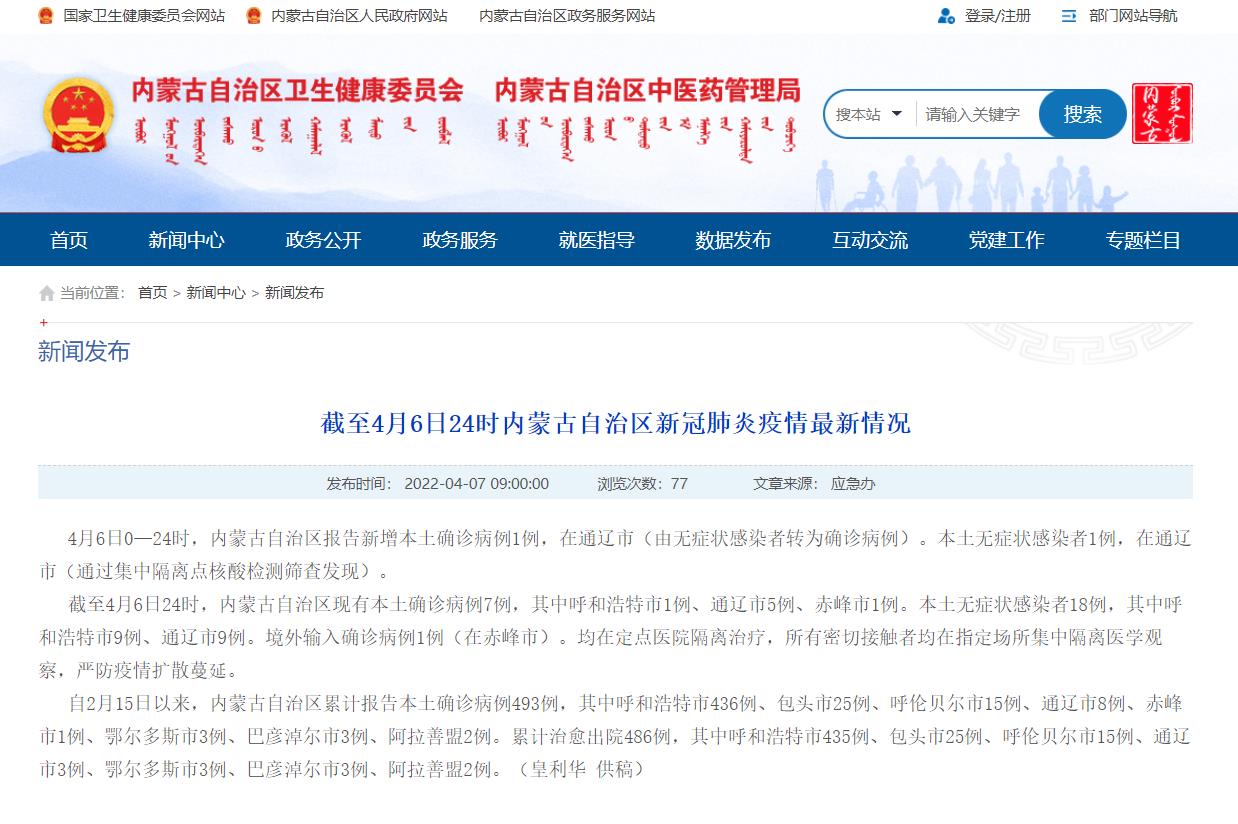 人民網呼和浩特4月7日電(趙夢月)4月7日,據內蒙古自治區衛生健康委員會通報,4月6日0—24時,內蒙古自治區報告新增本土確診病例1例,在通遼市(由無癥狀感染者轉為確診病例)。本土無癥狀感染者1例,在通遼市(通過集中隔離點核酸檢測篩查發現)。